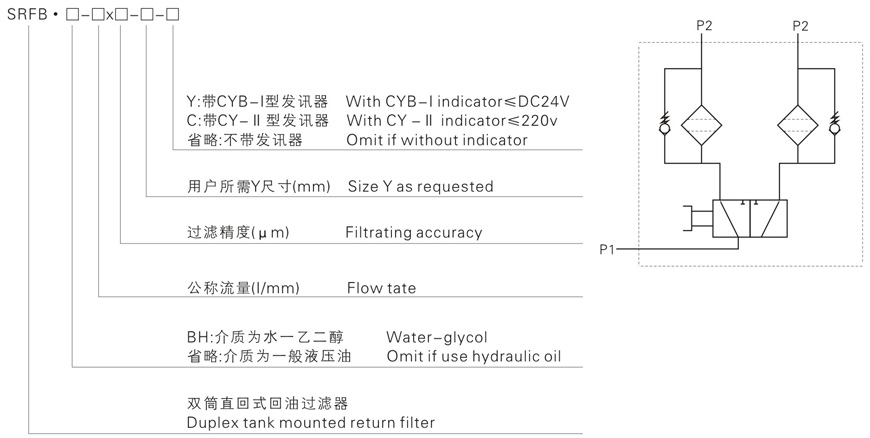 注:*為過濾精度,若使用介質(zhì)為水一乙二醇帶CYB-Ⅰ發(fā)訊器,則過濾器型號(hào)為:SRFB·BH-63×*-Y,濾芯型號(hào)為SFBX·BH-63×*.