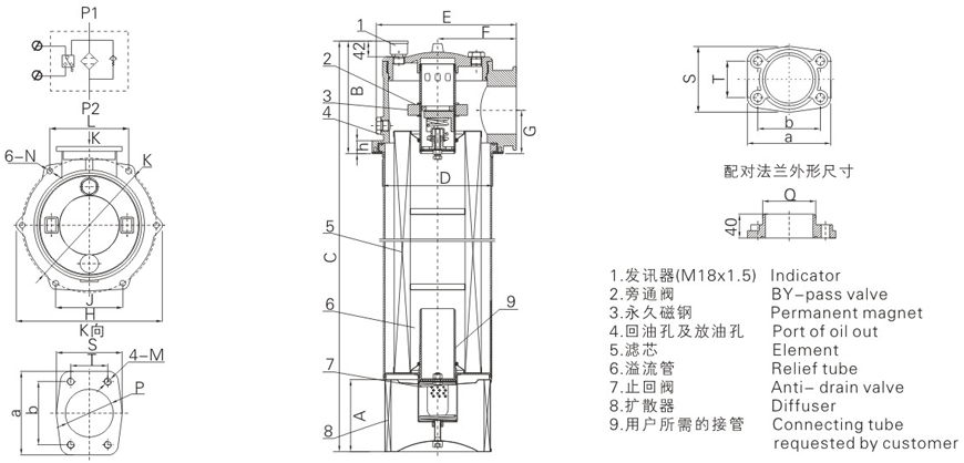 6、具有目測(cè)指示和電發(fā)訊二合一發(fā)訊裝置、溢流管、積污盅;當(dāng)濾芯逐步堵塞后,可在目測(cè)表上觀察濾芯堵塞情況,同時(shí)還可接電發(fā)訊(發(fā)訊值為0.35MPa)。在濾芯底部設(shè)置溢流管及積污盅,更換濾芯時(shí)可隨同一起帶出,從而避免了污染物重新掉入油箱內(nèi)的現(xiàn)象。